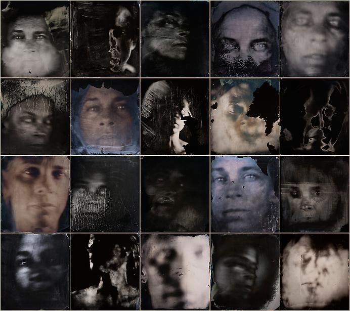 …Mann complicates the logic of the flattened geometrical order with references to the antiquated, the irrational, and the horrendous. The repetitive display of degraded images calls to mind discards from a mid-nineteenth-century photo studio – plates flawed by the sitter’s movement or the medium’s unstable actions, of which they present a catalogue: pitting, scarring, scratching, streaking, graininess, blurriness, erosion, fading, haziness, delamination, over-exposure, and under-exposure.