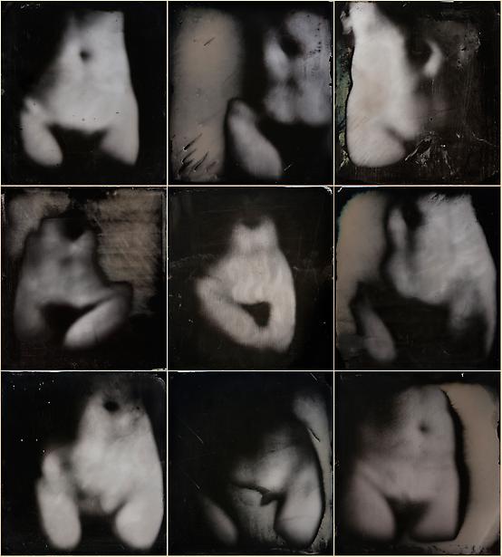 That was an optimistic sentiment; it was many months more of recovery and limited activity, a torment for a prolific artist. But Sally Mann found she could take pictures of herself without having to haul the camera around, finding a trove of material within the confines of her own face (Self-Portraits) and her own damaged torso (Omphalos). Mann has continued, now long after her recovery, to make more then 200 new ambrotypes since the accident in 2006. And characteristic of Sally Mann, the artist has created a new technique for this project which is based on 19th century processes but that incorporates a modern sensibility. Each unique image is captured as a wet-plate positive on a large, black glass plate and then is joined with others in groupings of 3, 9, 20, and even up to 75 plates.