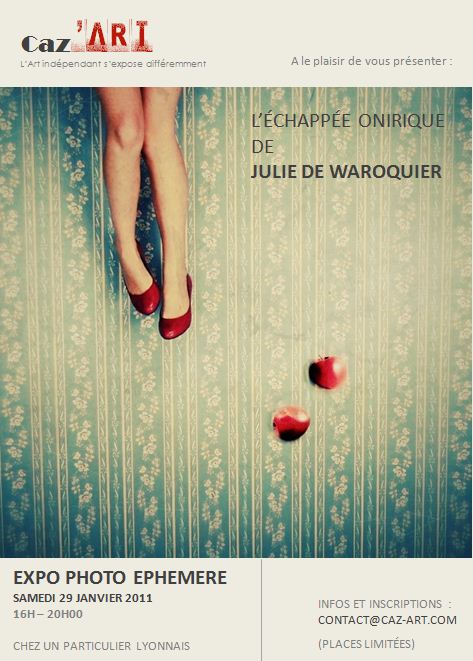 ***Caz'ART vous invite à quitter les souliers de la réalité pour rejoindre l'univers onirique et surréaliste de Julie de Waroquier. Une vingtaine de photos seront exposées au domicile d'une particulière lyonnaise, dont la sympathie et l'enthousiasme nous permettent de vous proposer un modèle d'exposition complètement atypique. !!! Info pratique : l'adresse et le plan d'accès seront communiqués par mail uniquement sur demande d'inscription sur : contact@caz-art.com. (Merci de nous indiquer vos nom+prénom)