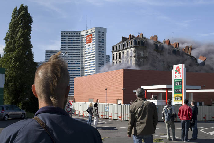 La sédimentation de la ville s’opère par couches successives. Un modèle prolifère sur les décombres du précédent, on démolit, on reconstruit. L’image est connue : l’implosion en public des grands ensembles périurbains. La série Downtown Corrida du photographe Alban Lécuyer propose de transposer un patrimoine persistant, héritier de l’histoire et des modes architecturales du continent européen, dans l’environnement anachronique des chantiers de démolition. Rendus génériques par le simple jeu des perspectives ou de la répétition en série, les hôtels particuliers et les façades en tuffeau du XVIIIe siècle deviennent à leur tour précaires, instables. Leur écroulement fait écho à la vulnérabilité de l’habitat périphérique, produit d’un après-guerre en reconstruction et d’une fin de siècle en pleine crise du logement. En privant les objets de mouvement, l’instantané produit alors de nouveaux volumes dont l’excentricité célèbre la fracture, la dislocation, et prône un retour à la fonction oblique de Claude Parent et Paul Virilio. En arrière-plan se dessinent les contours d’une cité empruntée aux peintures métaphysiques de Giorgio de Chirico, un espace morcelé où le champ de vision heurte sans cesse les limites d’une parcelle, d’un terrain, d’un chantier. Les paysages se referment progressivement pour devenir des intérieurs, des périmètres sans issue où l’on devine la métamorphose d’une ville enceinte, à la fois close et en instance de mutation. L’homogénéité des climats et la répétition des motifs participent à la confusion entre documentaire et trucage. Une esthétique proche des vues d’artistes placardées sur les chantiers pour annoncer une nouvelle architecture, écologique et mondialisée, dont la forme s’affranchit du territoire dans lequel elle s’inscrit. La corrida minérale qui se joue dans le décor d’une topographie fictive devient alors tour à tour ironique, théâtrale ou surréaliste.