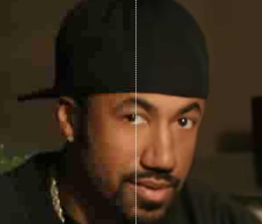 Comparaison de la même image, à taille égale, au format JPEG ( à gauche de la ligne) et BPG (à droite)