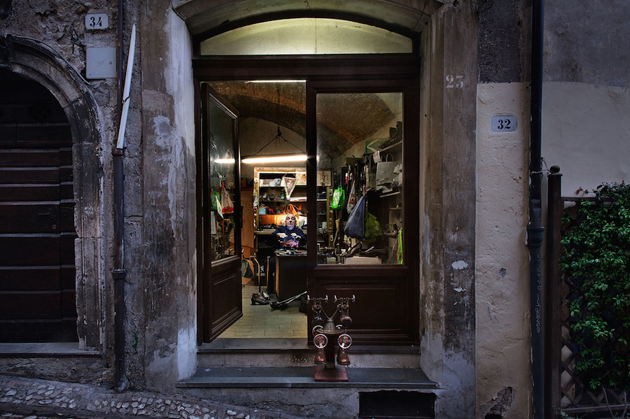 Francesco Pergolesi was raised in Spoleto, a small Italian village filled with artisan shops and small businesses. Now splitting his time between Spoleto and Barcelona, Pergolesi creates photographic tableaus inspired by memories from his past: narrow cobblestone streets, the sound of a hammer coming from the open door of a shoemaker; the smell of fresh bread from a baker, the steady beat of a sewing machine from an open window, the smell of old paper in a used bookstore. In Pergolesi’s world, these sights and smells drive his art making, as he seeks to preserve the past, before big-box and chain stores arrive. As he says: