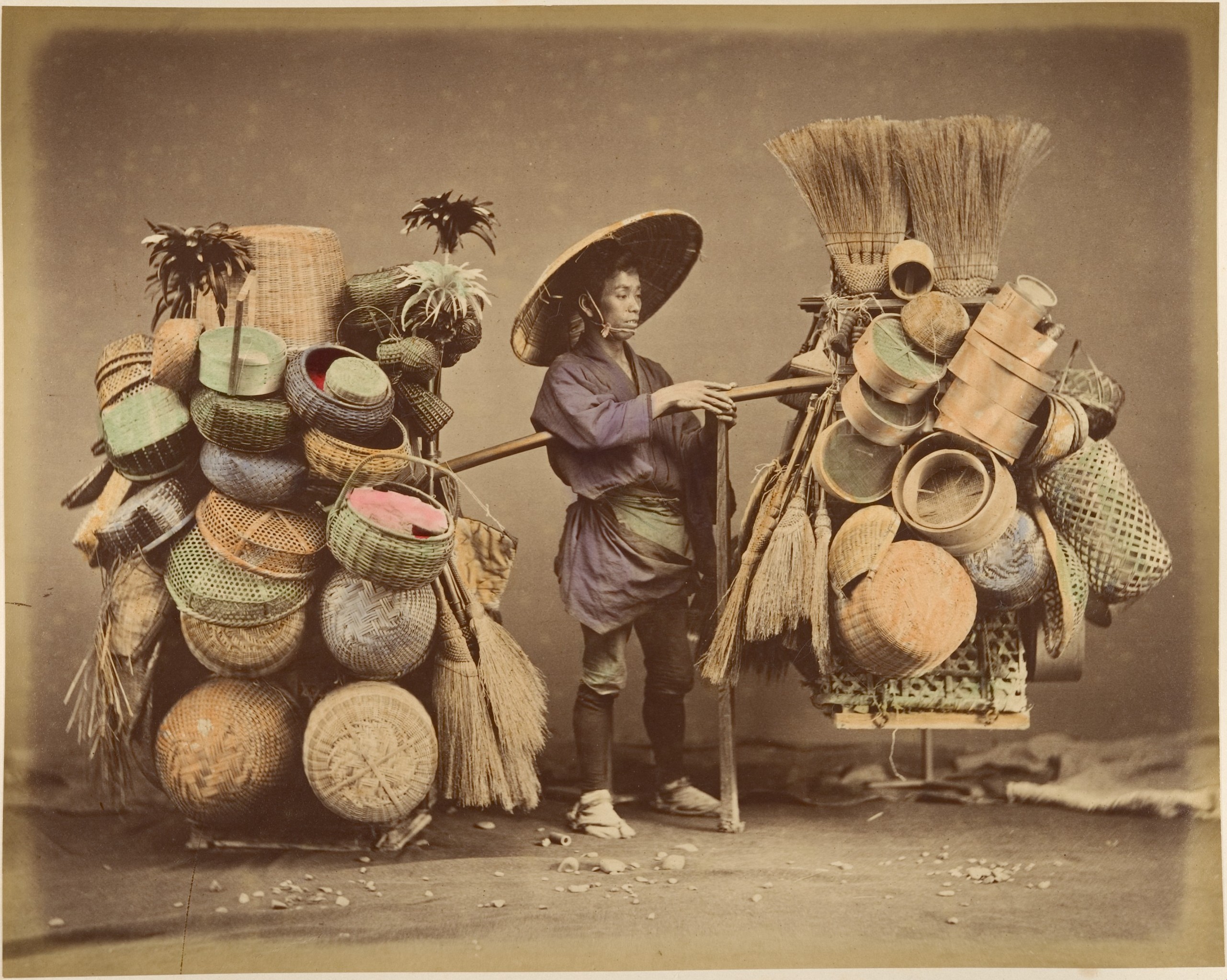 [Japanese Man Posing with Baskets, Brooms and Feather Dusters] 1870s © Unknown